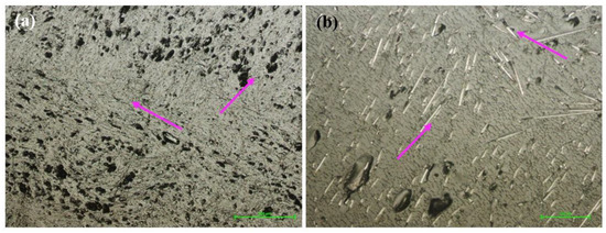Figure 7a,b show the microstructure inside (core) the samples manufactured by FFF with an infill density parameter of 100%. The different orientations of the carbon fibers are found (Figure 7a,b, purple arrow), depending on the deposition direction of the molten material bead. The microstructure on the lateral side of the sample (Figure 7c,d), compared to those of the samples with 25%, 50% and 75% infills, contains fewer voids between beads (Figure 7c, D areas) and the carbon fibers are oriented (Figure 7d) along the direction of the printed beads. In the cross-section from Figure 7e,f, it is found that the voids in the microstructure have a uniform distribution, that is, they respect to a certain extent a pattern and they are on the same line. Both in the bottom side of the section (Figure 7e) and in the top one (Figure 7f), interlayer cracks (interlaminar interface) were identified and the porosity increased from the bottom to the top side of the sample.