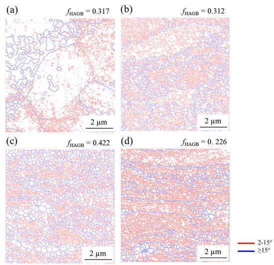 An EBSD grain boundary map of the microstructure after DSR and ESR. (a) After first pass of DSR; (b) after second pass of DSR, (c) after fourth pass of DSR; (d) after fourth pass of ESR. fHAGB is the fraction of high angle grain boundaries.