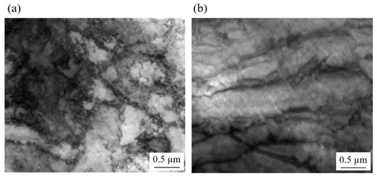 The necklace structure and the alteration from elongated grains surrounded by LAGB to the UFG structure with HAGB were consistent with the microstructure formed via continuous dynamic recrystallization (cDRX). During severe plastic deformation at room temperature, polygonal grains became elongated, and a high density of dislocations were generated. The generated dislocations developed into fine cell structures whose boundaries were LAGB. As the deformation progressed, dislocations continuously accumulated at the cell boundaries. The combined Burgers vectors of these dislocations would increase the misorientation between the cells, and thereby, the boundaries gradually developed into HAGB [20,21]. Since the process occurs homogeneously throughout the material, it is referred to as “continuous”. As a result, the full UFG structure could be achieved.