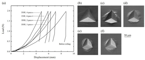 (a) Load-displacement curves for the samples acquired by nanoindentation. Indentation images for the samples: (b) prior to rolling; (c) after the first pass of DSR; (d) after the second pass of DSR; (e) after the fourth pass of DSR; and (f) after the fourth pass of ESR.