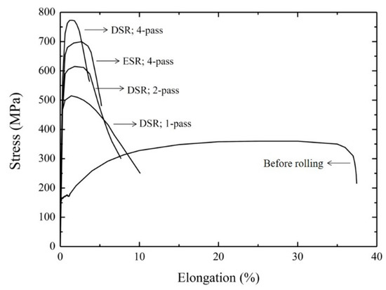 As shown in Figure 6, the overall tendency of the yield strength was consistent with that of nanoindentation in that both properties increased with an increasing of the number of passes. For instance, the yield strength of the sample after a 4-pass of DSR exhibited 780 MPa, which was approximately five times higher than prior to DSR. It was noted that the yield strength after the fourth pass of ESR was lower in comparison to the case of DSR. Furthermore, the total elongation was reduced as the number of passes increased; after the fourth pass of either DSR or ESR, the total elongation was <6%.