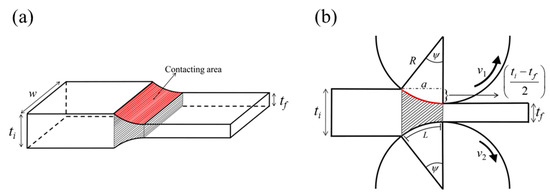 where R is the roll radius and ti, tf is the initial and final thickness of the process. In addition, the deformation volume V can be expressed as [32]