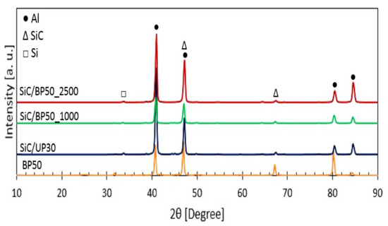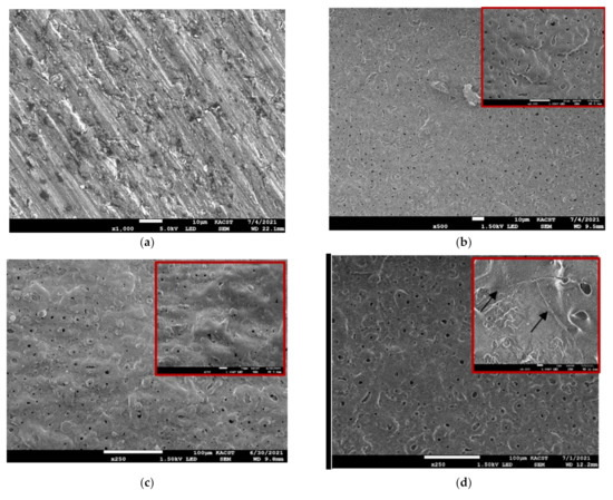 The variation in surface morphology (pore density and size) between samples revealed that the addition of SiC to the base alkaline solution during PEO had a significant impact on the pore morphology, as shown in Figure 1b,d. This stemmed from the surface morphology’s dependency on the electrolyte’s electrical conductivity [25,30]. Adding SiC and selecting the unipolar current mode with a duty cycle of 30% to SiC/UP30 (Figure 1c) led to the formation of moderately large pores with a lower pore density. Nevertheless, coating with the bipolar current mode and increasing the duty cycle to 50% in SiC/BP50_1000 reduced the density and size of the pores compared with those produced with the unipolar mode, as shown in Figure 1d. As previously described, the pores’ characteristics depended on the final voltage. The higher the end voltage applied, the larger the spark on the SiC coated surface. In addition, the initial cracks on the PEO coating surface penetrated the surface due to the high thermal stresses [31]. The final voltage is therefore considered a significant parameter in the PEO-coated surface’s morphology. Additionally, the surface of the AA2014 SiC/BP50_2500 sample contained far more uniformly distributed pores with both smaller sizes and a much higher pore density compared with the coatings processed at a lower frequency (the SiC/BP50_1000 sample), as shown in Figure 1d. The large number of micropores that formed on the surface could be attributed to electrolyte vapors and/or oxygen trapping and growth.