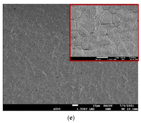 SEM micrographs after conducting the corrosion test of the AA2014 samples subjected to PEO coating under various conditions: (a) BM, (b) BP50, (c) SiC/UP30, (d) SiC/BP50_1000, and (e) SiC/BP50_2500.