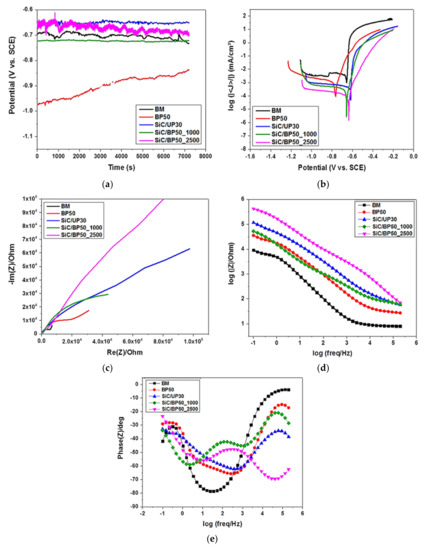 The open circuit potential (OCP) for the AA2014 samples both before and after coating was plotted against immersion time, and is shown in Figure 6a. All the coated AA2014 samples exhibited shifting in the corrosion potential (Ecorr) toward the positive side, except for the sample coated without SiC (BP50). This shift indicates more passivity in the surface. The AA2014 BM sample did not exhibit any alterations in OCP, while the SiC/BP50_2500 sample showed the largest fluctuations in OCP. However, the BP50 sample had the largest shift in Ecorr in the negative direction of potential. These fluctuations in potential could be traced back to the porosities present in the coating’s surface.