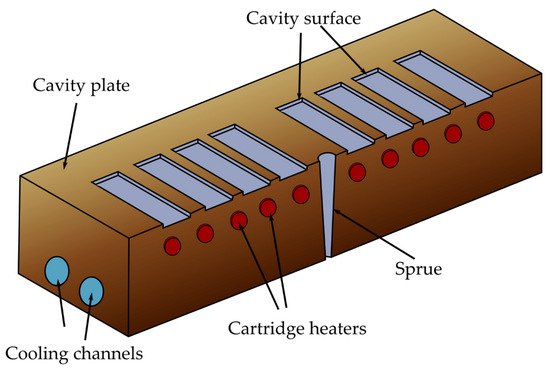 - Wang, G.; Zhao, G.; Guan, Y. Thermal response of an electric heating rapid heat cycle molding mold and its effect on surface appearance and tensile strength of the molded part. J. Appl. Polym. Sci. 2012, 128, 1339–1352. [Google Scholar] [CrossRef]