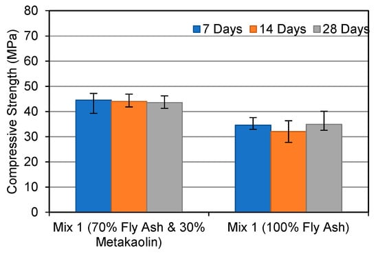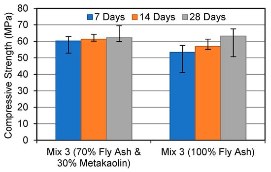 When compared to the FA-based geopolymer, the FA and MK-based geopolymer samples demonstrated a maximum gain in strength of 30% when an alkaline solution molar ratio of 1.0 was utilised. The strength of the FA and MK-based geopolymers improved the greatest after 28 days, with the FA-based geopolymers improving by 9.8%. In Mix 3, the strength of both geopolymers was equal. The compressive strength difference between each increment in the alkaline molar ratio is noteworthy in this study. This shows that FA-based geopolymers are more affected by the alkaline solution ratio. In contrast, the FA and MK-based geopolymer performed better in the early stages. The strength of the FA and MK-based geopolymers, for example, was 13% higher at 7 days than the FA-based geopolymer. Zhang et al. (2014) [] discovered that a 50/50 mixture of FA and MK geopolymers exhibited higher compressive strength after being heated than 100% FA geopolymers. The researchers also discovered that a geopolymer containing both FA and MK had a better compressive strength than geopolymers based on MK.