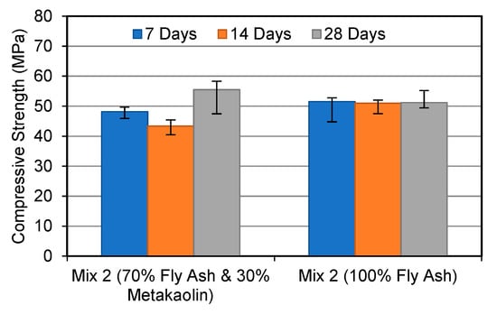 The plate-shaped particles, on the other hand, produce rheological challenges, increasing the processing complexity as well as the water need of the system. The geopolymer made from fly ash (FA) is often more durable and stronger []. FA-based geopolymers, on the other hand, are observed to have a substantial quantity of pores. The addition of metakaolin to FA-based geopolymers can result in a denser structure, which can result in increased strength. Because metakaolin alone produces a weak structure, it is combined with additional elements []. The strength, microstructure, and nanomechanical characteristics of several geopolymer mixtures based on metakaolin and fly ash are described in this work. At 7, 14, and 28 days, the compressive strengths were assessed. SEM and XRD were used to investigate the microstructure.