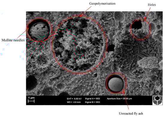 Figure 4 shows an example of several geopolymerisation phases. Mullite needles are found in the fly ash particle, indicating partial geopolymerization. The image also shows the remaining fly ash particles after the bond has been broken and geopolymer gels have formed and diffused throughout the structure, indicating that it has reached crystalline phase. Finally, the particle has a smooth surface, indicating that it did not participate in the geopolymerisation process and is, therefore, an unreacted FA particle. Numerous holes and compacted geopolymer gels may also be seen in the image.