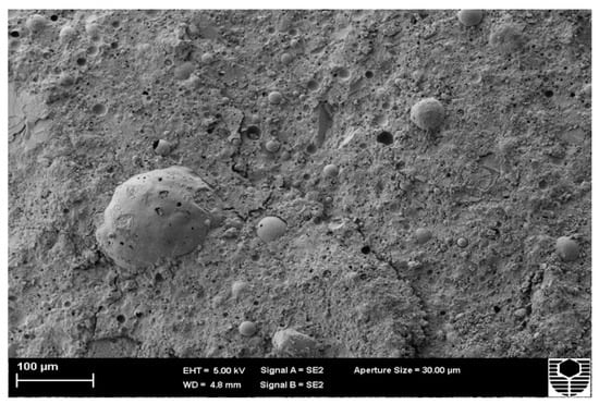 Figure 5 and Figure 6 depict the microstructure of FA and MK-based geopolymers with 1.0 (Mix 1) and 2.5 (Mix 3) molar ratios of alkaline solution, respectively. The structure becomes less porous with fewer unreacted FA and MK particles as the alkaline solution molar ratio of the FA and MK-based geopolymer utilised in this study is increased, resulting in a stronger structure. The compressive strengths of Mix 1 and Mix 3 were 44 MPa and 62 MPa, respectively, as shown in Figure 1. By “extending the reaction”, an increase in the molar ratio of sodium silicate to sodium hydroxide, or an increase in the use of sodium silicate, aids in the geopolymerisation process. More FA and MK particles can react as a result, resulting in a more compact structure. Figure 5 also shows matrix porosity generated by FA or MK particles that failed to fully react during the geopolymerisation process.