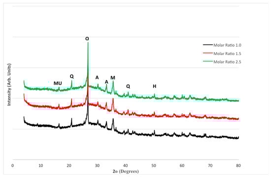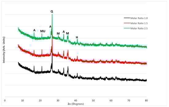 The XRD patterns for FA and MK-based geopolymers are shown in Figure 9. The largest peak, which can be observed at around 27°, was identified as quartz (SiO2). Amorphous phases are also indicated by multiple tiny peaks between 20° and 40°. Mullite, Maghemite, Haematite, and Aluminum Silicon Oxide (Al2 SiO5) are among the other phases discovered. Despite the increase in compressive strength seen in Figure 1, there is little variation between the three blends. On the other hand, the intensity of quartz in Mix 3 with a molar ratio of 2.5 is slightly higher. A rise in compressive strength usually corresponds to an increase in the intensity of crystalline products, particularly quartz. This is in line with the fact that Mix 3 has a higher compressive strength, as well as a denser matrix, as seen in Figure 1.