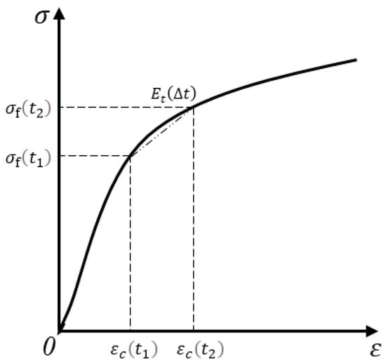 Assuming that the concrete longitudinal length is far larger than the length of other directions, the capillary tension and auto-shrinkage of other directions can be omitted. Under this condition, the stress–strain correlation on the longitudinal length should be taken into consideration, namely the stress correlation between the capillary tension and the free auto-shrinkage strain. The capillary tension and the free shrinkage strain at the moment of and can be obtained by testing and computing. This meant that the average of the elastic modulus of a micro-matrix around the capillary, , between and could be obtained, which could indicate within the time of . Below is the specific approach: