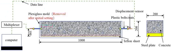 Auto-shrinkage test specimens were measured with the linear variable differential transformer (LVDT) installed in the center of the two ends of the test specimens. The measurement precision and scope were set to be 1 μm and 2 mm, respectively. In order to ensure the accuracy of LVDT, two nuts were placed in the center of the two ends of every test specimen. After the initial setting of concrete, the organic glass mold was removed, and the two plastic bolts were both screwed into the two nuts. After that, the LVDT test bar had a direct contact with bolts. The computer was used to automatically measure the records, and the experiment measured the shrinkage of all plain concrete as well as the shrinkage of test specimens inbuilt with the steel plate, whose thickness is 20 mm, 40 mm and 60 mm, respectively. The impact of temperature on concrete could be measured through a preliminary test. Specifically, the temperature and humidity sensor were built into every sample, and all test specimens were placed under the environment at the temperature of 20 ± 1 °C and the relative humidity of 60 ± 5%. There was one specimen per group for the shrinkage test.