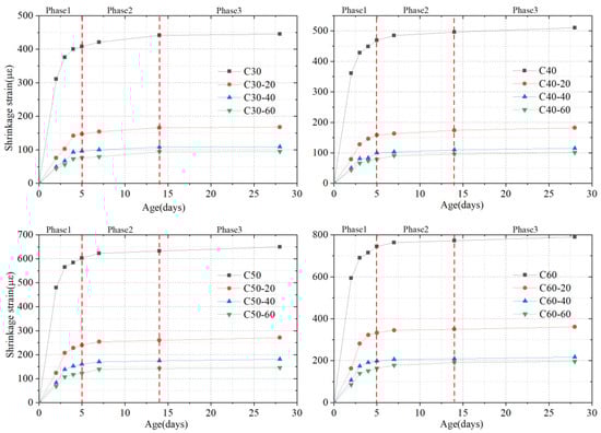 As shown in Figure 6, steel plates after being placed in concrete test specimens of different strengths were all obviously constrained, resulting in the decrease of shrinkage at every stage. For example, the C30 plain concrete test specimen shrinkage was 445 με on the 28th day. After 20 mm-tick steel plates were added, the shrinkage of the constrained test specimens was 168 με, which was reduced by 277 με. In terms of C60 test specimens, the shrinkage of the plain concrete test specimens was 790 με on the 28th day. After 60 mm-thick steel plates were added, the shrinkage was 196 με on the 28th day, which dropped by 594 με. Additionally, steel plates of different thicknesses can exert different degrees of the constraining effect on concrete. The thicker the steel plate is, the stronger the constraining effect of the steel plate is on the concrete, and the lower the shrinkage of concrete. Take C40 concrete, for example. When the shrinkage of any moment was chosen for comparison, the same results could be obtained, including C40 > C40-20 > C40-40 > C40-60. Other concrete strengths were found with the same phenomenon. Moreover, the curves of different steel plates were compared, demonstrating that with the increase of the steel plate thickness, the impact of the steel plate thickness on the concrete shrinkage would gradually weaken. Take C50 concrete, for example. The shrinkage of C50 concrete without adding steel plates was 650 με on the 28th day. After 20 mm-thick steel plates were added, the shrinkage of C50 concrete was 271 με on the 28th day. After 40 mm-thick steel plates were added, the figure changed to 181 με. After 60 mm-thick steel plates were added, the figure changed to 146 με. The shrinkage difference between C50 and C50-20 on the 28th day was 379 με; the shrinkage difference on the 28th day between C50-20 and C50-40 was 90 με; the shrinkage difference on the 28th day between C50-40 and C50-60 was 35 με. It can be found that, as the steel plate thickness increased, the shrinkage difference decreased, accordingly.