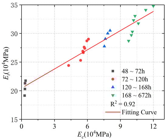 According to Table 8 above, Figure 7 further displays the fitting curve of the elastic modulus of a micro-matrix around the capillary, , and static elastic modulus, . It can be observed that there was a positive correlation between them, and that their correlation coefficient was 0.92. The computing formula after fitting could be obtained and written as below: