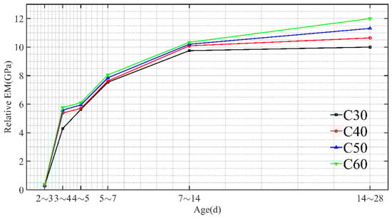 As shown in Figure 8, as the concrete age increased, the elastic modulus of a micro-matrix around the capillary kept on increasing. The elastic modulus of a micro-matrix around the capillary growth of concrete was within 168 h. After 168 h, the elastic modulus of a micro-matrix around the capillary was gradually stabilized. On the whole, consistent with the changing rule of the concrete elastic modulus under static compression, the elastic modulus of a micro-matrix around the capillary increased rapidly in the first 7 days but slowed down after 7 days and finally became stabilized. Similarly, the higher the concrete strength was, the higher the elastic modulus of a micro-matrix around the capillary of concrete.
