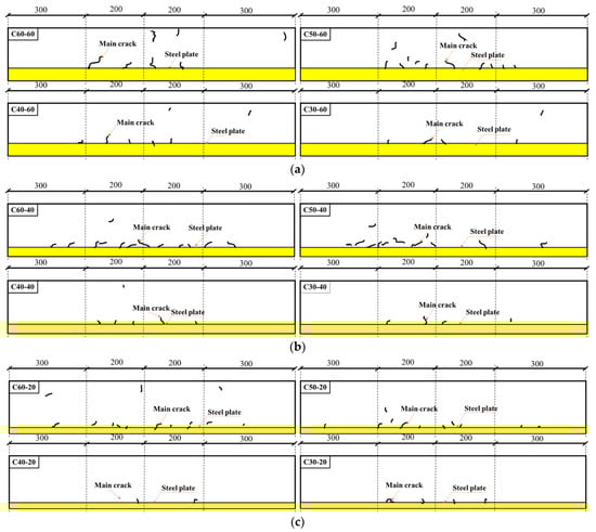 In a bid to better display the crack form and position, the concrete actual crack chart was simplified into Figure 9. The chart shows the cracking models of four kinds of concrete test specimens (C30, C40, C50 and C60) after steel plates of different thicknesses were added. In Figure 9, the yellow area is where steel plates are placed, while the black curve is the concrete crack. As one observes in Figure 9, the main cracks of four kinds of test specimens were concentrated in the middle area and the overall distribution was relatively even. When the steel plate thickness remained unchanged, the higher the concrete strength was, the more the cracks could be found on test specimens, and also the more compactly the cracks would be distributed thereon. When the concrete strength remained the same, the higher the steel plate thickness was, and the more the cracks would be found at the interface between the steel plate and the concrete.