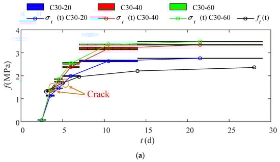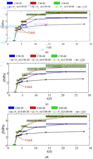 According to obtained in the previous part and combining the restraint shrinkage, was obtained by computing, and the restraint stress, at different initial cracking times, could be obtained by computing. At the same time, the concrete tensile strength, , of the corresponding time could be obtained by the test. The specific results are shown in Figure 10. The intersecting point between the restraint stress curve and the concrete tensile strength curve marked the cracking time of the concrete. Take the C30 concrete, for example. The C30-40 and C30-60 restraint curve and the concrete tensile strength curve were intersected between the 3rd day and the 4th day. This meant that, under the same constraints, the higher the concrete strength was, the earlier the cracking. Table 10 shows how to compute the restraint stress using the elastic modulus of a micro-matrix around the capillary, . Thereby, in Figure 10 where the predicted concrete cracking time and the true concrete cracking time were compared, only C30-20 was found with the difference between its predicted cracking time and the true cracking time. All the rest demonstrated good agreement with the predicted results.