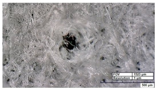 Samples were prepared as described previously [21]. The K, Na, Ca, and Mg solutions (prepared in the Institute of Optoelectronics Military University of Technology, Warsaw, Poland) with a concentration of 10–1000 µg m/L were pipetted onto circles of filter paper (Munktell & Filtrak, Niederschlag, Germany) of 1.6 cm diameter (2 cm2). Then, 15 µL of each calibration solution was prepared in deionized water (Cobrabid-Aqua Sp. z o.o. Warsaw, Poland) from Na, K, Ca, and Mg standards for AAS (Fluka Chemie GmbH, Buchs, Switzerland). Next, they were dried for 2 h and then exposed to laser radiation for 24 h. A Hirox KH 6700 digital microscope (Hirox Co. Ltd., Tokyo Japan, Hirox Europe Ltd. Ecully, France) was used to take pictures showing the structure of a filter paper sample after laser irradiation. An example for an Na sample is shown in Figure 1. To verify our calibrations, three reference materials (SRM 1577b—bovine liver, INCT-T/L—tea leaves, and NCS ZC91002—human hair) were used with certified values for all four elements. The weighed samples of materials (approx. 0.25 g) were mineralized in a mixture of acids—HNO3 and HClO4 (3:1). The residues after mineralization were transferred to measuring flasks with a volume of 25 mL.