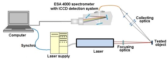 In the experiment carried out in the normal environmental conditions, we used a Quantel BigSky laser model Brio (Big Sky Laser Technologies, Bozeman, MT, USA, QUANTEL S.A., Les Ulis, France). It generated 56 mJ of 1064 nm radiation in a pulse of 4 ns width. A laser beam of 4 mm diameter was focused on the flat filter paper using a 150 mm lens. The real distance between the lens and the target was set to 145 mm to avoid a random laser spark in the air. Laser parameters were optimized in such a way that no burn-through occurred at the target. Three laser pulses, necessary for obtaining one useful spectrum, provided reasonable reproducibility and low scattering of results. Radiation of the LIBS plasma was registered using an ICCD camera with a Kodak KAF 1001 detector mounted on the ESA 4000 echelle spectrometer (LLA Instruments GmbH & Co KG, Berlin, Germany). The experimental system (Figure 2), the same as the one used in [21], allowed us to obtain the spectral resolution of λ/Δλ~20,000.