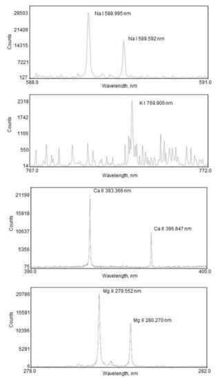 Such an approach is correct for all four elements since their content in the reference samples is lower than 250 µg/mL. Calibration curves for low element concentrations (0–100 µg/L and 0–250 µg/mL) are shown in Figures S5–S8 in the Supplementary Materials. Corresponding equations of regression, as well as coefficients of determination for low content, are also shown in Figures S5–S8. The K I 769.9 nm line intensities were much lower than those for the Na I, Ca II, and Mg II lines. This resulted in higher standard deviations of the measured values and lower coefficients of determination. Unfortunately, due to the optical arrangement of the ESA 4000 spectrometer, the more intense 766.5 nm K I line could not be observed, which is shown and explained in Figure S9 in the Supplementary Materials. In general, the results presented in Figures S5–S8 in the Supplementary Materials show the correct choice of experimental parameters such as sample size or the procedure of preparing standard samples, as well as the calibration procedure.