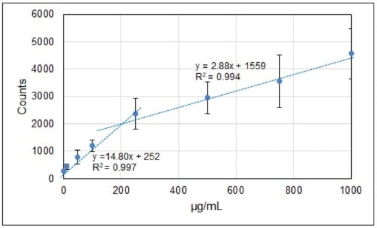 As an example, shown in Figure 4, the calibration curve for K, as with those for the other three elements, is not a single linear trend line across the whole content range—it can be better approximated by two linear trend lines, which are particularly justified for low content (0–250 µg/mL), for which the slope is five times higher than for the 250–1000 µg/mL interval.