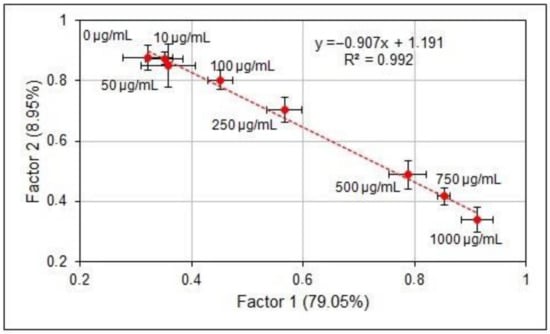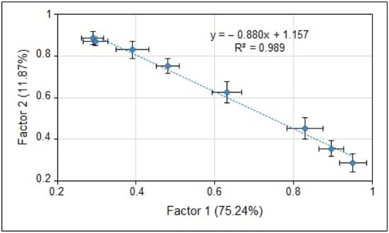 It can be seen in Figure 5 and Figure 6 that the averaged LIBS spectra (points in the F1–F2 plane), for samples of the adequate element content, carry together over 80% of the input variance. This allows the application of FA in the calibration process. Knowledge of spectral data is not necessary—analysis is carried out on the entire spectra. However, coefficients of determination are lower, which is understandable since, across the whole spectrum, the influence of the matrix composition is stronger than for the selected spectral lines measured in a narrow spectral band.