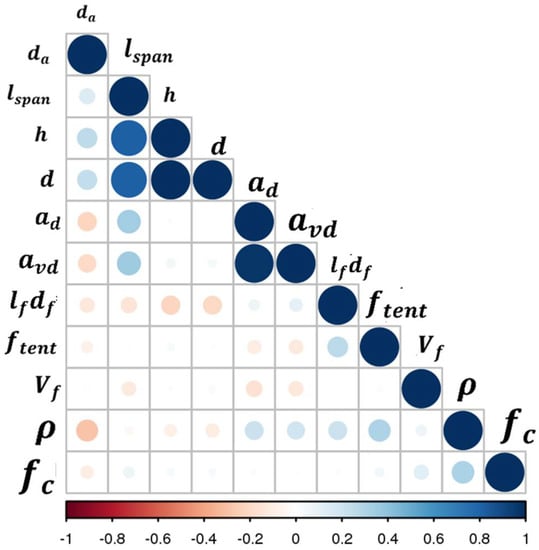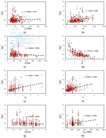 This section is concerned with a parametric study performed to enhance the understanding of important factors influencing the shear strength of steel fiber reinforced concrete (SFRC) beams. The aim is to create a set of circumstances across which only one parameter, affecting the outcome of interest, varies. To achieve this objective in the current parametric study, it is essential to make concrete compressive strength uniform, so that its confounding effect is minimized. Therefore, the shear strength values are normalized with respect to the concrete compressive strength to create a circumstance in which the effect of the compressive strength on the outcome is small in comparison with other varying key factors under study. There exists some discrepancy in the literature on whether to normalize with respect to square root or cube root of concrete compressive strength []. Therefore, a preliminary statistical analysis is carried out for the selection of the appropriate option. Truly, Figure 1a suggests that the slope of the dataset trendline with respect to the square root of the concrete compressive strength is low; showing the elimination of concrete compressive strength from the shear strength parametric study. The data in Figure 1 are derived from the experimental published data supplementary materials. This input data are also shown in the form correlation matrix in Figure 2. The following can be observed from the plots in Figure 1: