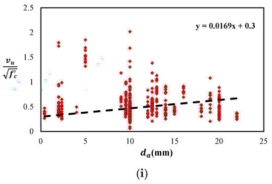 The effect of aggregate size in the steel fiber reinforced concrete (SFRC) beam is observed in Figure 1i, which is different from that of the conventional reinforced concrete beam. In the conventional RC beams, a large aggregate size tends to increase the shear strength of RC members due to the improved interlocking action. In contrast, the smaller aggregate size of steel fiber reinforced (SFRC) concrete results in a more uniform concrete matrix providing a better bond between the fiber and concrete, thereby improving the shear strength, as shown in Figure 1i [,].
