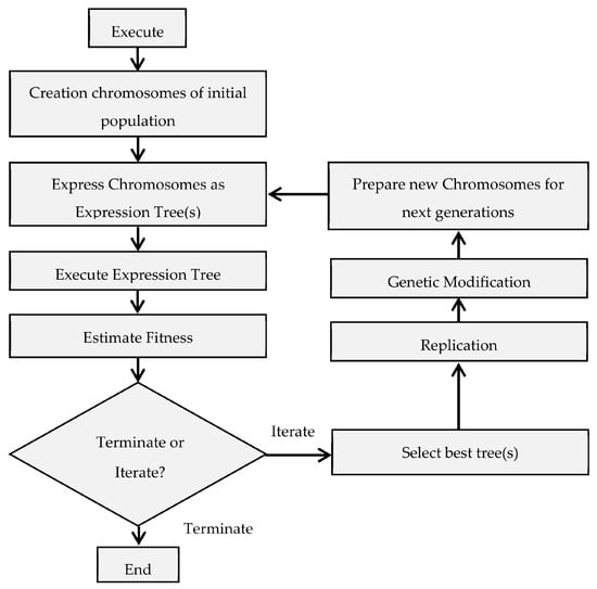 Gene expression programming (GEP) [] is a genetic algorithm that generates mathematical models from the supplied data in a domain-independent manner []. GEP is different from the genetic algorithm GAs and the genetic programming GP in terms of chromosome representation. More specifically, in GAs, the term “chromosomes” refers to linear strings of a fixed length; however, in the GPs, the term “chromosomes” refers to nonlinear entities of various sizes and shapes. Instead, GEP encompasses both a linear string with a predetermined length and a multi-dimensional ramified structure with a wide range of possible sizes and shapes.
