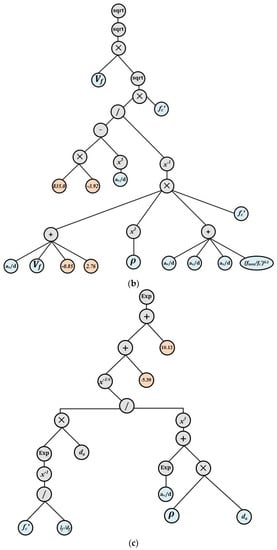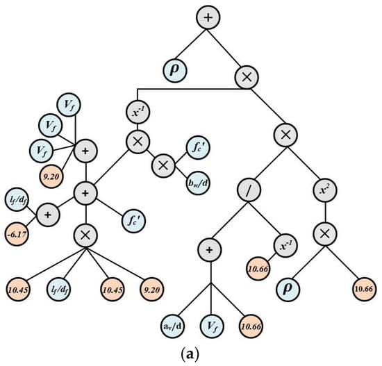 where define the width of a beam, the effective depth of the beam, the reinforcement ratio, the length to span ratio, the diameter of aggregate, the concrete compressive strength, the fiber volume fraction, and the fiber tensile strength. The gene expression trees based on Equations (3)–(5) are shown in Figure 4, along with the model construction parameters shown in Table 2.