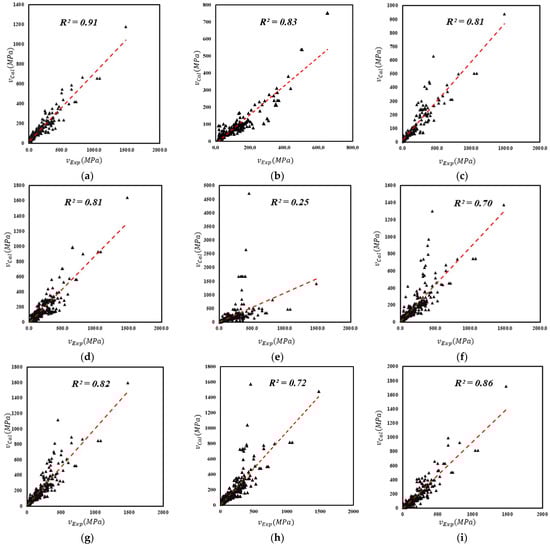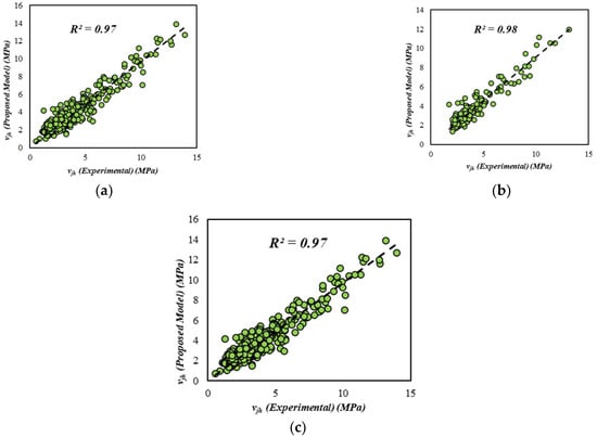 The graphical plots of experimental and predicted values are demonstrated herein. It can be seen from Figure 7 that the coefficient of determination of the current model is R2 = 0.97, which shows better prediction when compared to the other available models. In addition, higher performance factor and lower average absolute error suggest the merit of the current model. The model of Imam et al. [] demonstrates the least predictive ability because the model is developed using a narrower range of aggregate sizes. Therefore, this model fails to predict the shear strength accurately where the aggregate size does not fall within the range of validity.