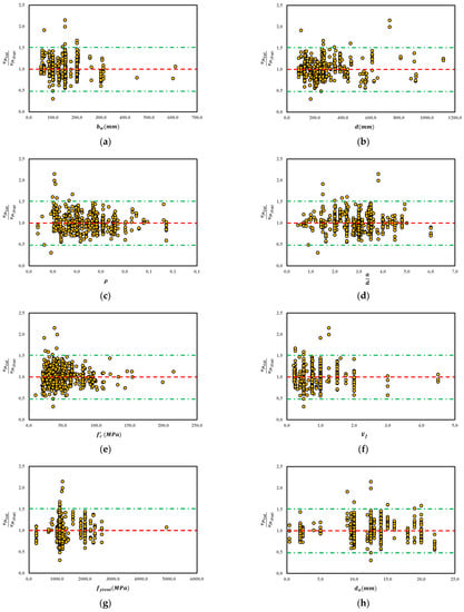 As a continuation of the parametric study discussed in Section 4, the sensitivity of various influencing parameters in the proposed model is investigated in Figure 6. The main influencing parameters contributing toward the shear strength of steel fiber reinforced concrete (SFRC) beams include beam width (, the beam effective depth , the longitudinal reinforcement , the shear span to depth ratio , the concrete compressive strength , the fiber volume , the fiber tensile strength and the diameter of aggregate . As shown in Figure 6a, the model accuracy of beam width has an average of 1.00, which shows a suitable performance of the proposed model in various levels of , since the appropriate range is within 0.5–1.5. Similarly, Figure 6b shows an identical predictive performance of 1.0 by comparing the results of the shear strength obtained analytically to experimental effective depth of the steel fiber reinforced (steel fiber reinforced concrete (SFRC)) concrete beams. Likewise, it is of interest to note that the other influencing parameters shown in Figure 6c–f, i.e., , , , , , and , all exhibit an acceptable accuracy of 1.00, which lies within the appropriate range. This confirms the suitability of the proposed model to predict the experimental counterparts with reasonable accuracy.