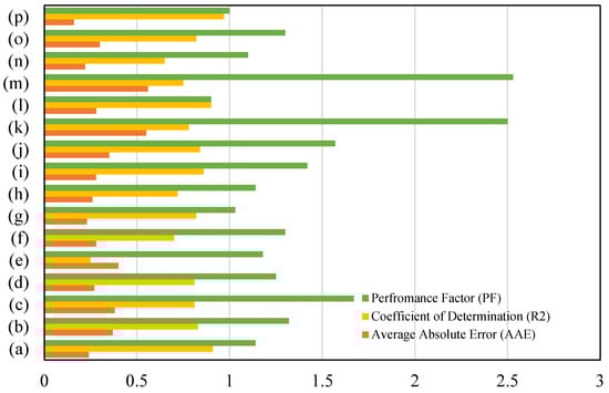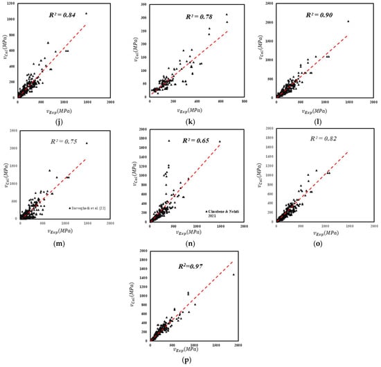 Comparison of proposed model with existing models: (a) Greenough and Nehdi [], (b) Kunita et al. [], (c) Shin et al. [], (d) Sharma et al. [], (e) Imam et al. [], (f) Ashour et al. [], (g) Kwak et al. [], (h) Narayanan and Darwish [], (i) Shahnewaz and Alam [], (j) Shahnewaz amd Alam [], (k) RILEM [], (l) Gandomi et al [], (m) Sarveghadi et al [], (n) Chaabene and Nehdi 2021 [], (o) Sabetifar et al. [], (p) Proposed model.