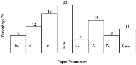 Sensitivity analysis is carried out to assess the contribution of each input variable to the predicted value. The frequency values of these variables are presented in Figure 9. It is clear from this figure that the proposed model is most sensitive to the shear span to depth ratio and least sensitive to the diameter of aggregate . The frequency value of the fiber tensile strength is 11%, indicating a sizable sensitivity. The sensitivity of different input parameters is in accordance with the parametric study of Section 4.