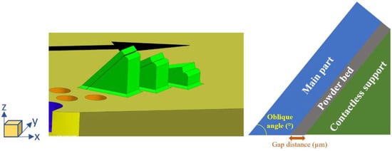 There is a novel type of support structures called “contact-free” or “contactless” supports. These supports do not touch the main part’s overhang surface but still provide the necessary heat evacuation to some extent during printing [42]. Given that the relevant support structures are not in contact with the main part, the overhang surfaces could be produced with a better surface finish. Moreover, time and cost arising from the subsequent support removal post-processes could be reduced [42]. In addition, at some locations, depending on the complexity level of the part geometry, it may be impossible to remove the supports. Xiang et al. [43] obtained results indicating that melt pool properties are affected considerably by the oblique angle which is inferred as the angle between the x-axis of the build plate and the overhang feature of the part. It is found that the melt pool length along the scan direction is longer on the overhang feature because of the lower thermal conductivity of the powder bed in comparison to the bulk material [43]. In light of this aspect, Cooper et al. examined the outcomes of contact-free support structures by replacing them with conventional support structures making contact with overhangs in the E-PBF process and attained reasonable improvement in terms of distortion of overhangs [42]. Paggi et al. [44] studied contact-free supports for Ti Gr23 powder in the L-PBF process aiming at 0, 30, and 45 degrees of overhang angles. The outcomes indicated that using contact-free supports significantly reduced the warping but the average roughness did not improve. As shown here, there is a very limited number of studies on contact-free supports although they are very promising to remove the need for post-processing and to widen the application area of L-PBF.
