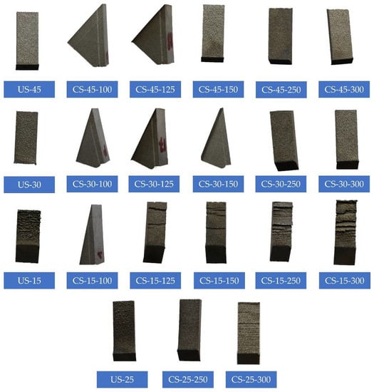 Figure 2 shows the contact-free supported samples manufactured by the L-PBF method. It is clearly seen from Figure 2 that some of the contact-free structures are fused to the overhang surfaces and could not be manually removed from the specimens. Therefore, the parts which could not be separated from the support structures or those separated but still exhibited a very poor surface quality were not involved in the characterization studies. Regarding the oblique angle of 45° of overhang surfaces, contact-free support structures were stuck on overhang surfaces at 100 and 125 µm of gap distances. In addition to 100 and 125 µm of gap distances, contact-free support structures were also stuck on the overhang surface of 30° at 150 µm of gap distance. When the oblique angle was decreased to 15°, all samples were unsuccessful. For a gap distance of 100 µm, the support structure and the main part were fused and for the rest of the gap distances, the surface quality of the overhang surfaces significantly deteriorated. It is seen that the fusion phenomenon is observed at relatively low gap distances and/or build angles. It is assumed that when the build angle gets lower at the overhang’s outermost layer, the freestanding melt pool deeply penetrates the powder bed. In addition to this reason, it is well known that the heat accumulation per area increases with decreasing build angle, which also serves as a catalyzer for the fusion of the support structure and overhang. On one hand, it could be stated that decreasing the gap distance between the contactless support and overhang surface increases the heat dissipation and thereby, decreases the possibility of fusion between support and overhang surface. Yet, the fusion taking place at lower gap distances in this study proves that the contact-free support does not suffice to maintain unsticking. Therefore, it could be stated that the dramatic intrusion of the melt pool dominates the heat dissipation provided by contact-free structures at lower gap distances. Finally, as mentioned above, when the build angle decreases from 45° to 30°, contact-free structures could not tolerate sticking problems at even 150 µm of gap distance. It is also important to mention that another set of coupons was printed by the L-PBF method in the same print having an oblique angle of 25°, which is between 15° and 30° at 250 and 300 µm gap distances. In other words, 3 different sets of coupons, which are identified as US-25°, CS-25°-250 µm, and CS-25°-300 µm were successfully printed and successfully separated from the contact-free supports as shown in Figure 2 as well.