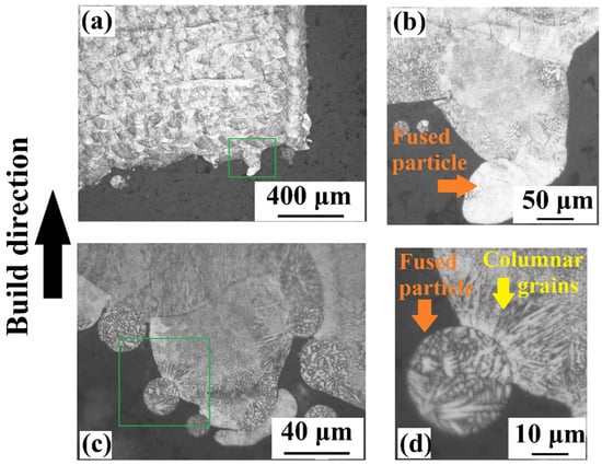 Figure 3a–d shows different cross-sectional OM images of unsupported overhang surfaces. As could be seen from Figure 3a, a protrusion, which is squared as green, is observed at the overhang surface of US-45°. The height of the melt pool is approximately 150–200 µm and a fused particle is observed at the tip of the melt pool (Figure 3b). It is considered that the relevant liquid melt pool exists at a free standing layer protruded into the powder bed opposite to the build direction and a fusion occurred between the tip of the melt pool and particles existing in the powder bed during solidification. In other words, the larger heat accumulation at lower oblique angles favors the deep penetration of the melt pool into the powder below based on high capillary forces, and the overhang surface ends up with a dross formation, which is an indication of poor surface quality as also observed by other researchers [53]. Regarding the cross-sectional OM images of US-30°, there is another protruded melt pool around 80–100 µm in height, exhibiting fused particles around itself, which explains the dross formation (Figure 3c,d). Figure 3d points out that a columnar grain structure is formed at the interface between the melt pool and particles in the powder bed. Following the protrusion of the melt pool into the powder bed, the contact between the melt pool boundary and the particles’ surface creates an interface, which alters the thermal gradient and affects the solidification dynamics. In other words, there should have been a relatively higher thermal gradient between the solid particle and liquid melt pool favoring a columnar grain structure. An increase in the fraction of fused particles onto the surface may end up with a relatively large columnar grain structure propagating from the material surface to the inside of the material up to 10–20 µm. It is well known that the columnar grain structure morphology may cause anisotropy and/or deterioration in the mechanical properties [54].