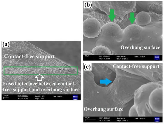 The Scanning Electron Microscopy (SEM) images obtained from the side view of CS-30°-125 µm are depicted in Figure 4a–c. As shown in Figure 2, the contact-free support and the overhang surface of the part are fused together during the printing of CS-30°-125 µm. Figure 4a exhibits the solidified large melt pools indexed with orange arrows at the overhang surface extending along the contact-free support surface. As shown below, those are the melt pools directly protruding into the powder bed. Provided that their height is larger than the predetermined gap distance, the support structure, and overhang surface fuse together. On the other hand, Figure 4b shows the depth of field view of the partially melted particles that are fused to the melt pool. According to Figure 4c, a particle could also contribute to the fusion of support structure and melt pool by creating bonding between them (indexed as bluearrow). As a result, even if the height of the melt pool is smaller than the gap distance, a particle could act as a bridge by being sintered to both overhang and contact-free support surfaces. Recalling that the samples could not be separated from the contact-free supports, it is concluded that the sticking issue took place at relatively low gap distances for 30° and 45° oblique angles of samples due to the reasons mentioned below. When the oblique angle was decreased to 15°, the height of the melt pool increased, and this increment also increased the critical gap distance to avoid fusion.