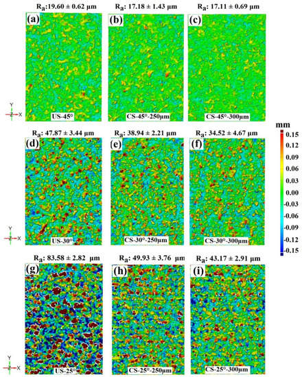 Surface texture maps derived from FV microscope images: (a) US-45°, (b) CS-45°-250 µm, (c) CS-45°-300 µm, (d) US-30°, (e) CS-30°-250 µm, (f) CS-30°-300 µm, (g) US-25°, (h) CS-25°-250 µm, and (i) CS-25°-300 µm.