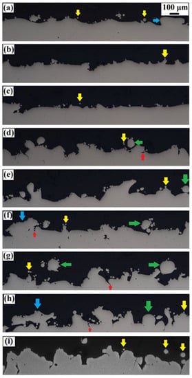 High roughness existing at overhang surfaces of additively manufactured samples brings about deep and sharp-tip valleys, which may cause a line-of-sight problem during FV and may end up with a higher fraction of point losses [55]. So, in addition to a relative comparison of the surface roughness values obtained through FV, it is useful to examine the surface profile towards the cross-section under OM and to observe the surface profile more realistically. For this purpose, Figure 6a–f shows the surface profile images of overhang surfaces at different oblique angles (25°, 30°, and 45°) and gap distances (unsupported, 250 and 300 µm). It is evident that the peak heights and valley depths remarkably increase when the oblique angle is decreased. Different types of formations are observed in the cross-sectional OM images, which are considered to drive the surface roughness of the overhang surfaces: (i) Attached particles to the surface, (ii) balling phenomenon, and (iii) inverted mushroom features. The attached particles to the surface are indexed by yellow arrows and as shown, all the overhang surfaces exhibit those independent of the oblique angle and gap distance. The balling phenomenon is especially observed at the overhang surfaces having an oblique angle of 30° and 15° as indicated by green arrows in Figure 6d–i. It is well known that the balling effect occurs by the solidification of a spherical droplet, which was splashed out from the liquid melt pool due to surface tension [56]. Thus, it can be stated that the local instabilities in the melt pool came into play at the overhang surfaces at lower oblique angles and this resulted in the local breaking up of the melt track and solidification of spherical particles. The other feature contributing to the surface roughness of the overhang surfaces are inverted mushroom-like structures indexed by blue arrows in Figure 6a,c,h. It is assumed that when the viscosity of the melt pool increases due to cool down, the melt pool tends to expand towards the nearby powder bed based on the surface tension resulting in an inverted mushroom-like shape after solidification. Additionally, there are crack-like sharp and deep valleys (in other words, undercuts) indexed by red arrows, which may deteriorate the fatigue properties since those regions come up as the potential for micro-crack propagation zones [9]. The important point is that the related undercuts are sharper and deeper on the overhang surfaces at 25° and 30° oblique angles compared to those of 45°. It is an expected phenomenon since the surface irregularities are more severe at lower angles and thereby, overhang surfaces relative at oblique angles are more prone to the sharp undercuts.