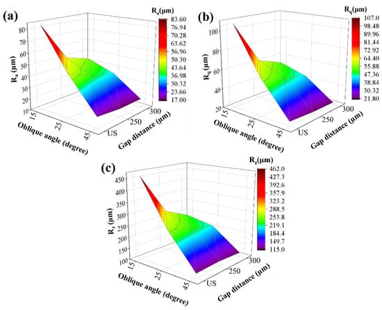 3D plots of surface roughness parameters: (a) Ra vs. oblique angle vs. gap distance, (b) Rq vs. oblique angle vs. gap distance, and (c) Rz vs. oblique angle vs. gap distance.