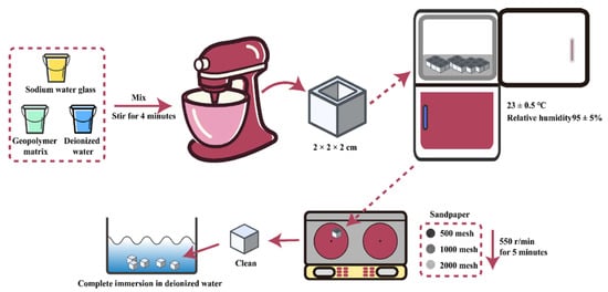 The fabrication process is shown in Figure 1, and the polishing process is detailed in Section 2.3. The components were mixed for 4 minutes and vibrated for 2 minutes. All specimens were then cast in a steel mold (with dimensions of 2 cm 2 cm 2 cm), sealed with cling paper, and cured in an environmental chamber—with temperature 23 ± 0.5 °C and relative humidity 95 ± 5—for 28 days (except for group 5 in curing time) [29].