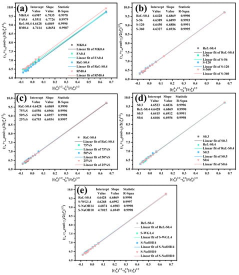 CA linear fitting of geopolymers: (a) various w/s ratios; (b) different ages; (c) blends of MK and slag; (d) various raw materials; (e) various activators.