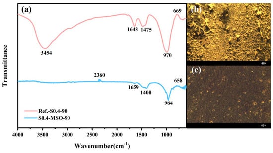 (a) The surface FTIR spectra and their stereo-microscope images; (b) Reference-S0.4-90 and (c) S0.4-MSO-90.