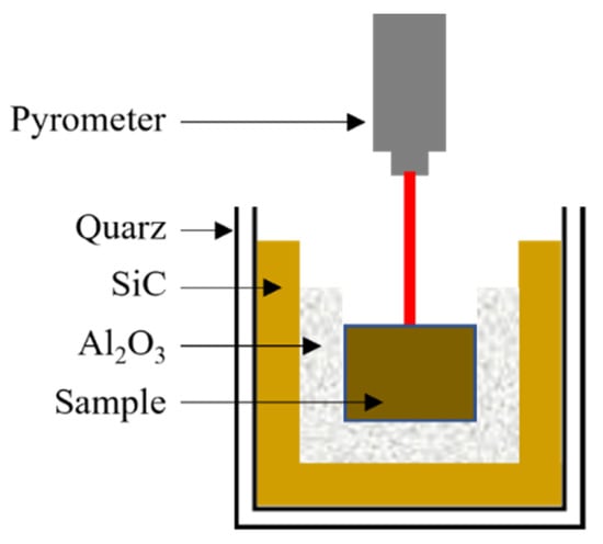 The calcination of mixed powders was carried out by conventional methods in air at 700, 750 and 800 °C with a heating rate of 3 °C·min−1 and a dwell time of 2 h, and microwave radiation in air at 650, 700, 750 and 800 °C with a heating rate of 30 °C·min−1 and a dwell time of 10 min. The microwave calcination temperature was measured directly on the powders using an optical pyrometer (CT-Laser 2MH, Optris GmbH, Berlin, Germany) and the previously calculated emissivity value of 0.833. Figure 1 shows the scheme of the microwave cavity, where the different layers used are observed: alumina fiber as a thermal insulator to protect the equipment, silicon carbide as an absorber material of excess microwave radiation and quartz as a sample holder.