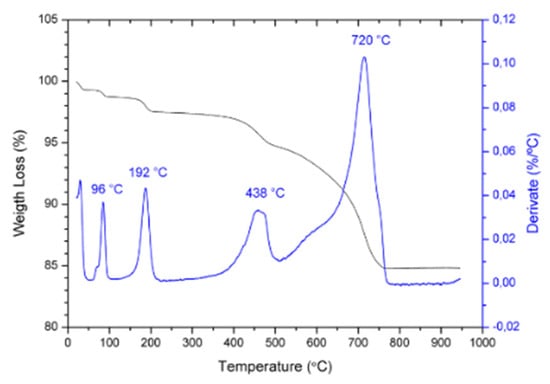 The thermogravimetric analysis of the KNL-NTS milled powder mixture before calcining showed four marked peaks in the derived curve (Figure 2). The first peak appears at 96 °C and corresponds to the loss of water with a weight difference of 8%. The second peak at 192 °C, corresponds with the decomposition reaction of hydrated carbonate to anhydrous carbonate with a 1.7% mass loss. The third and fourth peaks correspond with the decomposition of carbonates to oxides, which occurs in range of the 400–760 °C. From 760 °C no further weight loss occurs, indicating the end of the reaction. The temperature obtained agrees with the calcination temperature reported by other authors, which is in the range of 700–800 °C [22,25]. Therefore, the temperature range between 650 °C and 800 °C was selected for the calcination studies of the powders by conventional and microwave processes.