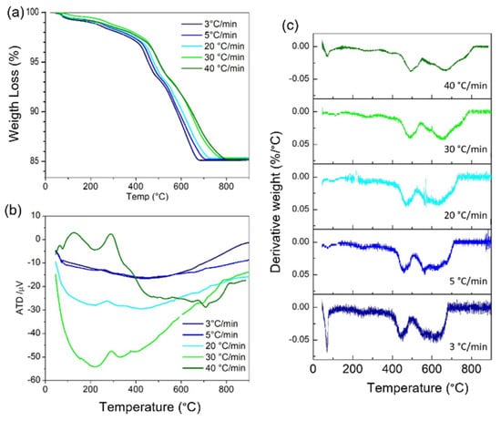 In order to determine the calcination reaction by the microwave process, a study of the influence of the heating rate on the thermogravimetric analysis was previously carried out. Figure 3 shows the TGA curves and derivatives performed on the uncalcined KNL−NTS powder mixture at 3, 5, 20, 30 and 40 °C·min−1 of heating rates from room temperature up to 900 °C.