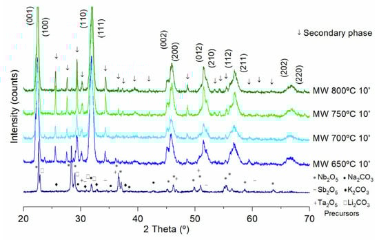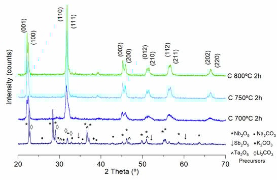 Figure 5 shows the X-ray diffraction peaks of the KNL-NTS powder calcined by microwave technology at 650, 700, 750 and 800 °C with a dwell time of 10 min at the maximum temperature and a heating rate of 30 °C·min−1. The peaks corresponding to precursors, oxides and carbonates are observed in the lower part of the graph.