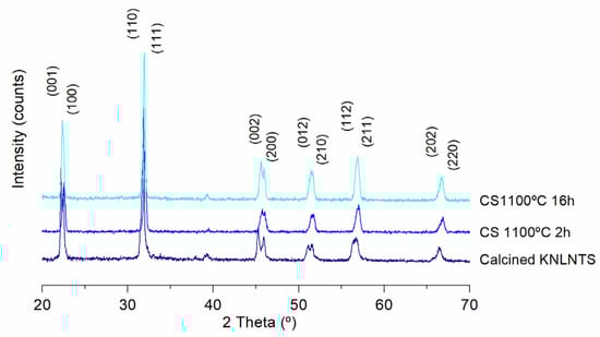 Sintering of the KNL-NTS materials was carried out from powders calcined at 800 °C for 2 h by the conventional method [25,26]. This choice is due to the previous study where it has been shown that under these conditions the pure perovskite phase predominates and there is no formation of secondary phases. Conventional sintering of KNL-NTS powder was carried out at 1100 °C for 2 h and 16 h of dwell time and 5 °C·min−1 of heating rate; these parameters are within the range established in the literature [27,28,29]. Figure 6 shows the X-ray diffraction patterns of KNL-NTS powders sintered by conventional process.